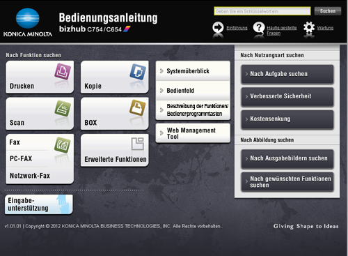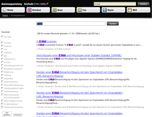 Über die Hauptseite (Startseite) der Bedienungsanleitung können Sie mit den folgenden drei Funktionen nach den gewünschten Informationen suchen.