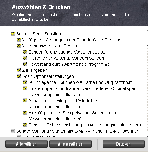 Aktivieren Sie die gewünschten Kontrollkästchen und klicken Sie auf [Drucken], um die ausgewählten Seiten gemeinsam zu drucken.