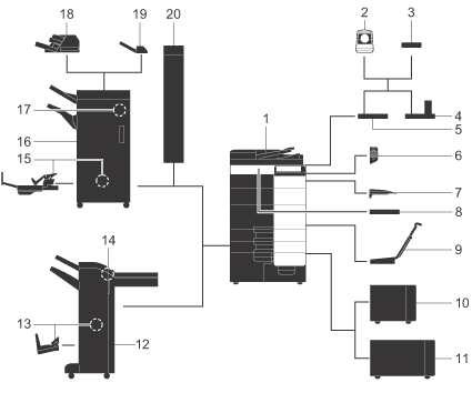 12 | Finisher FS-534 | Dient zum Sortieren, Gruppieren und Heften bedruckter Seiten vor der Ausgabe. |