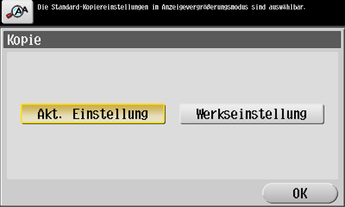 Zum Einrichten der Einstellungen wählen Sie [Bedienerprogramm] - [Administratoreinstellungen] - [Systemeinstellungen] - [Einst. für Anzeigevergrößerung] - [Standardanzeigeeinstellungen].
