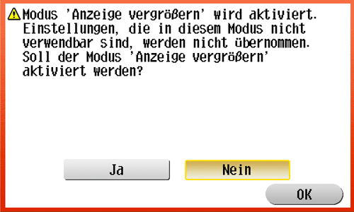 Tippen Sie auf Anzeige vergrößern, um zum Bildschirm "Anzeige vergrößern" zu wechseln, so dass die festgelegten Inhalte, die über die normale Bildschirmanzeige wiedergegeben werden, abgebrochen werden können. Öffnen Sie ggf. den folgenden Bildschirm, um zu prüfen, ob die für die normale Bildschirmanzeige eingerichteten Einstellungen aufgehoben werden sollen und ein Wechsel zur vergrößerten Anzeige erfolgen soll.