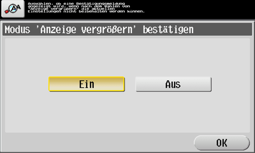 Tippen Sie auf [Zugangseinstell.] - [Modus 'Anzeige vergrößern' bestätigen] und wählen Sie aus, ob eine bezüglich des Modus "Anzeige vergrößern" vorgenommene Änderung durch Anzeige des betreffenden Bildschirms geprüft werden soll (Standard: [AUS]).