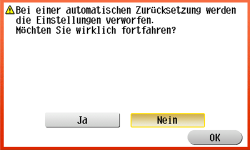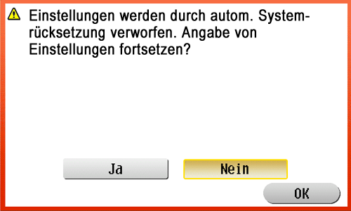 Wenn dieses System einige Zeit nicht genutzt wird, werden die Einstellungen automatisch zurückgesetzt. Öffnen Sie ggf. den folgenden Bildschirm, um zu prüfen, ob Einstellungen zurückgesetzt werden sollen.