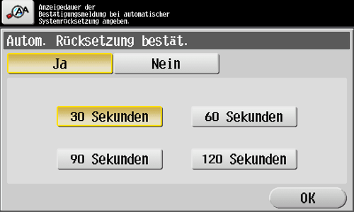 Tippen Sie auf [Zugangseinstell.] - [Autom. Rücksetzung bestät.] und wählen Sie aus, ob durch Anzeige des Bildschirms das Rücksetzergebnis geprüft werden soll (Standard: [Nein]). Wenn der Bildschirm angezeigt werden soll, geben Sie die Anzeigedauer an.
