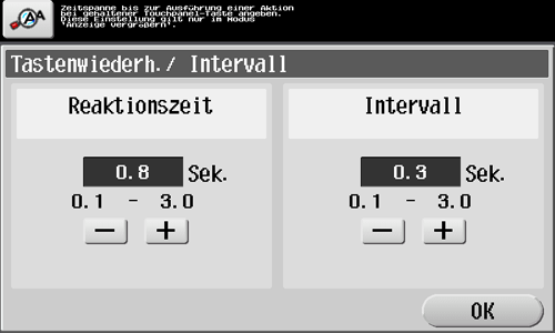 Tippen Sie auf [Zugangseinstell.] - [Tastenwiederholung / Intervall].