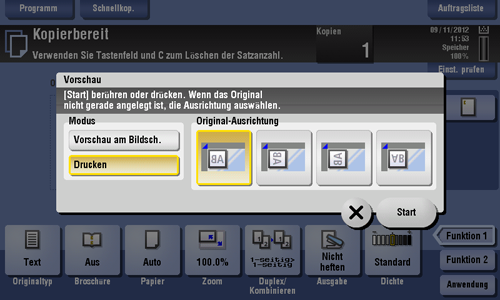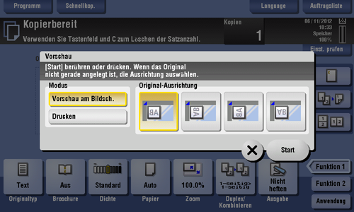 Tippen Sie auf [Vorschau], bevor Sie Start drücken, um die Ausgabe auf dem Touch Panel zu prüfen. Informationen zum Prüfen der Ausgabe finden Sie unter Hier.