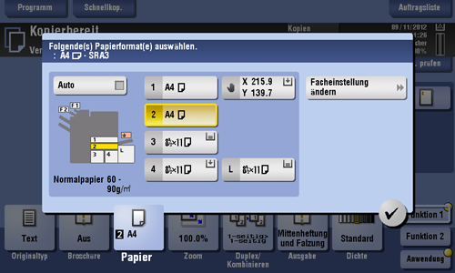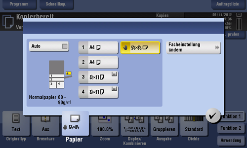 Wenn das Papier auf [Auto] eingestellt ist, wird eine Meldung angezeigt, dass das Papierfach gewechselt wird. Tippen Sie auf [Ja].