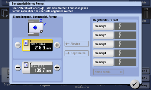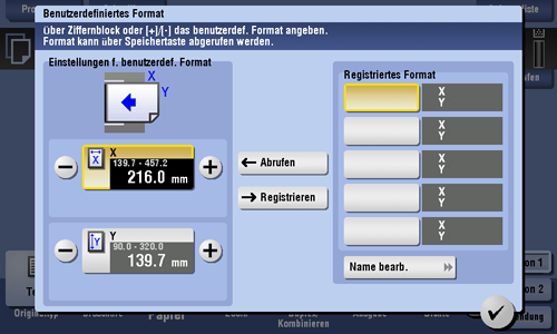 Geben Sie in [Einstellungen f. benutzerdef. Format] das Papierformat an, indem Sie Werte für die Länge und die Breite in [X] und [Y] eingeben. Tippen Sie dann auf [Schließen].
