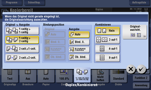Wählen Sie unter [Original -> Ausgabe] die Option [1-seitig>2-seitig] aus und wählen Sie dann unter [Ausgabe] die gewünschte Bindeposition für die Ausgabe aus.