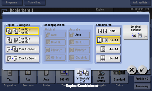 Wählen Sie unter [Kombinieren] die Anzahl der Seiten aus, die auf eine Seite eines Blatt Papiers kopiert werden sollen.