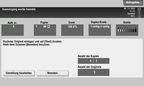 Nachdem der Kopierauftrag abgeschlossen ist, tippen Sie erneut auf [Unterbrechen].
