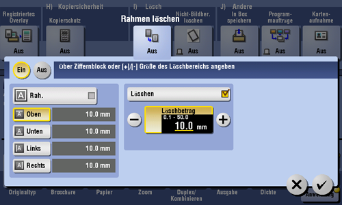 Um die vier Originalkanten in derselben Breite zu löschen, tippen Sie zur Angabe der Breite des zu löschenden Bereichs unter [Löschbetrag] auf [+]/[-] für einen Bereich in Zoll, tippen Sie auf [+]/[-] oder die Tastatur für einen Bereich in Zentimetern.