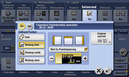 [Bindung links]/[Rechtsbindung] | Wählen Sie die Bindeposition für die Ausgaben aus. |