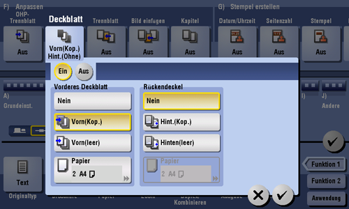 [Deckblatt] | Verwenden Sie diese Option, um die vorderen und hinteren Deckblätter auf anderes Papier zu drucken, wenn ein Original mit einem vorderen und einem hinteren Deckblatt kopiert wird. Beim Kopieren eines Originals ohne vorderes oder hinteres Deckblatt können Sie diese Funktion verwenden, um leere Blätter als vorderes und hinteres Deckblatt einzufügen. |