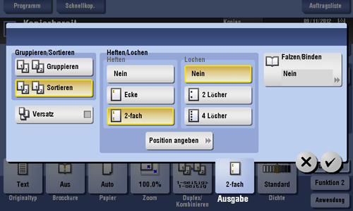 Tippen Sie auf [EIN] und konfigurieren Sie die entsprechenden Optionen für das Drucken und Binden.