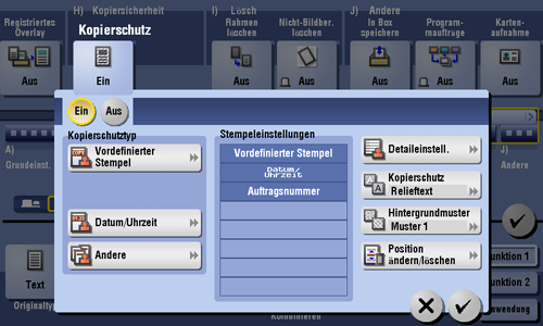 Tippen Sie auf [EIN] und konfigurieren Sie die entsprechenden Optionen für die Kopierschutzfunktion.