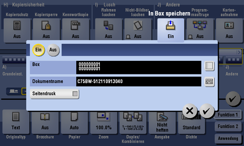 Tippen Sie auf [EIN], wählen Sie in [Box] eine Box zum Speichern aus und tippen Sie dann auf [OK].
