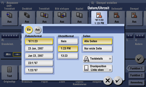 Tippen Sie auf [EIN], legen Sie Werte für [Datumsformat], [Uhrzeitformat] und [Seiten] fest und tippen Sie dann auf [OK].