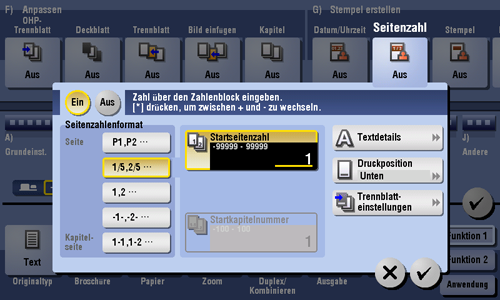 Tippen Sie auf [EIN], geben Sie Werte für [Seitenzahlenformat] und [Startseitenzahl] an und tippen Sie dann auf [OK].