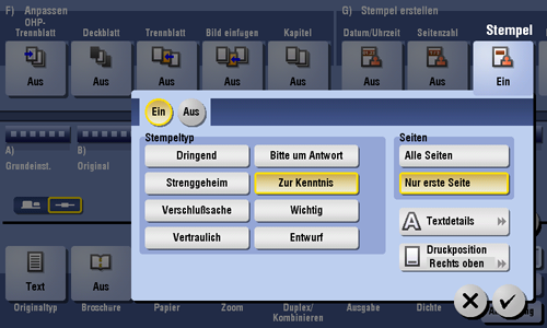 Wenn der Stempeltext, das Datum und die Uhrzeit oder die Seitenzahlen den Text des Originals überlagern, tippen Sie in jedem der Einstellungsbildschirme [Datum/Uhrzeit], [Seitenzahl] und [Stempel] auf [Druckposition], um die Druckpositionen festzulegen.