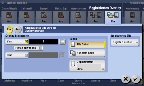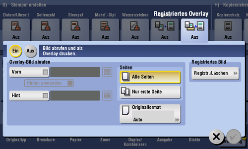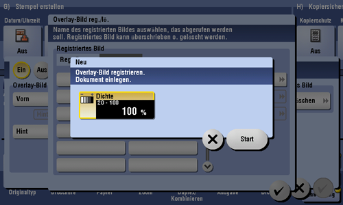 Legen Sie das Original mit dem zu registrierenden Overlay-Bild ein, legen Sie ggf. die [Dichte] fest und tippen Sie dann auf [Start].