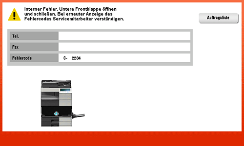 Wenn ein Fehler erkannt wird, wird die folgende Meldung angezeigt. Ergreifen Sie die Maßnahme, die der auf dem Bildschirm angezeigten Meldung angemessen ist. Wenn Sie den Fehler nicht beheben können, notieren Sie den [Fehlercode], stecken Sie den Netzstecker aus und wenden Sie sich an den Kundendienst.