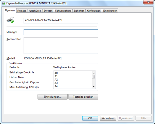Klicken Sie auf der Registerkarte [Allgemein] auf [Testseite drucken].