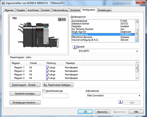 Wählen Sie in [Geräteoptionen] auf der Registerkarte [Konfiguration] die Option [Authentifizierung] oder [Volumenverfolgung (E.K.C.)] aus und wählen Sie dann die gewünschte Option unter [Einstell.] aus.