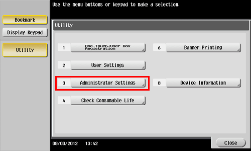 [Administrator Settings] | This button displays items that can be changed only by the administrator. To configure settings, you need to enter the administrator password for this machine. You can specify the initial operations of the copy, print, fax, or User Box function, power saving function, and network function to suit your requirements. Also, you can manage the use status of this machine or inhibit an information leakage by specifying the authentication or security function. |