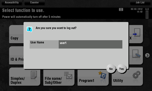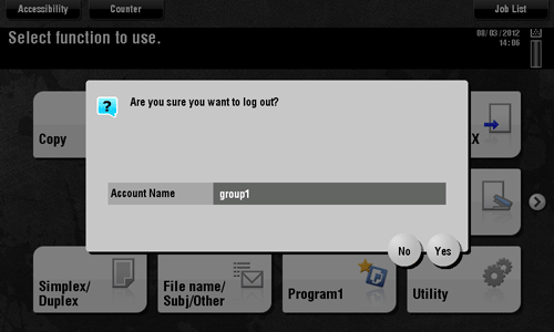 To configure settings, select [Utility] - [Administrator Settings] - [User Authentication/Account Track] - [User/Account Common Setting] - [Logout Confirmation Screen Display Setting].