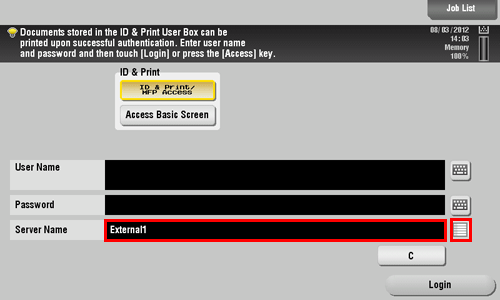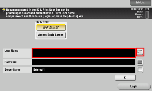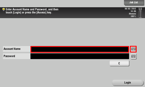Enter the user or account track name and the password on the Login screen, then tap [Login] or tap [Access] to perform authentication. After a target operation is completed, tap [Access] to log out.