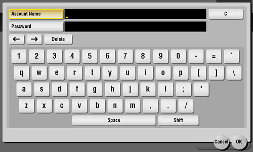 Enter the account name and the password to perform account track. The contents of the Login screen may vary depending on the authentication setting of this machine.