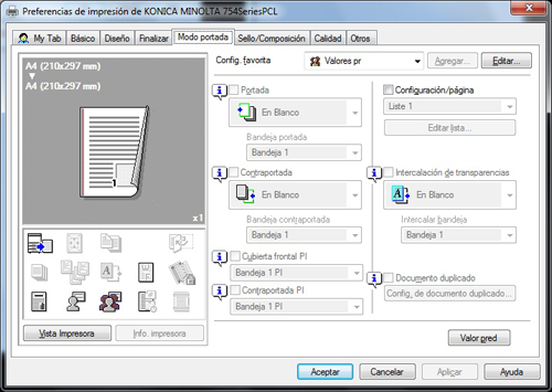 [Portada] | Seleccione esta casilla de verificación para insertar e imprimir en una portada. En [Bandeja portada], seleccione la bandeja de papel para la portada. A continuación, seleccione si debe imprimirse sobre la portada insertada.