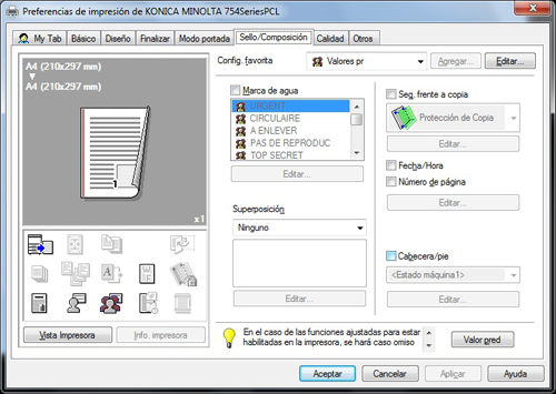 [Repetir sello] | En cada página del documento impreso, se imprime texto como "Copia" o "Privado" a modo de texto invisible. | |