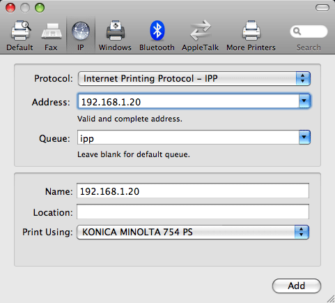 En [Address:], introduzca la dirección IP de la máquina. En [Queue:], introduzca "ipp".