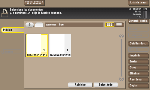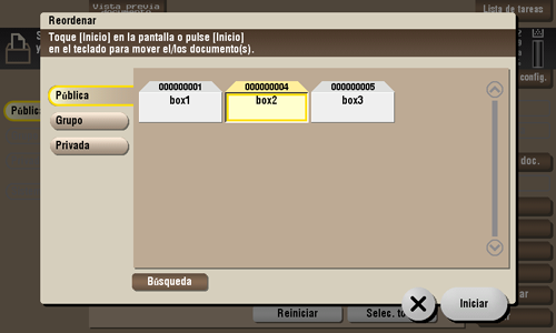 Seleccione un archivo y, a continuación, toque [Reordenar]. Ahora puede moverse el archivo a otra carpeta de usuario. El destino puede ser una carpeta de usuario pública, una carpeta de usuario personal o una carpeta de usuario de grupo. Seleccione una carpeta de usuario de destino y, a continuación, toque [Iniciar] o pulse la tecla Inicio.