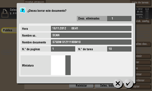 Seleccione un archivo y, a continuación, toque [Eliminar]. El archivo se ha eliminado. Es posible seleccionar varios archivos y borrarlos todos simultáneamente. Compruebe los detalles del archivo y, a continuación, toque [Sí].