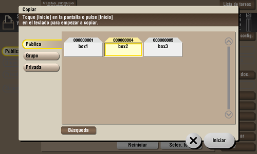 Seleccione un archivo y, a continuación, toque [Copiar]. Ahora puede copiarse el archivo en otra carpeta de usuario. Seleccione el destino de la carpeta de usuario pública, privada o de grupo. Seleccione una carpeta de usuario de destino y, a continuación, toque [Iniciar] o pulse la tecla Inicio.