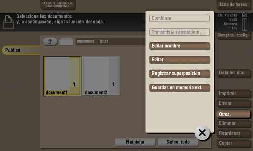 Introduzca un dispositivo de memoria USB en el puerto USB de la máquina, seleccione un archivo y, a continuación, toque [Otros] - [Guárdelo en memoria ext.]. Ahora puede guardarse el archivo en la memoria USB.