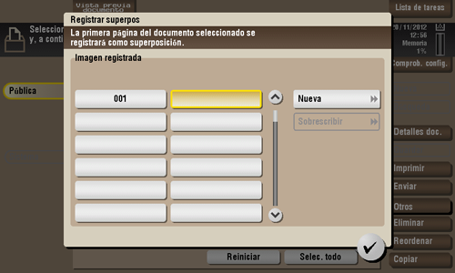 Una vez registrada, es posible componer una imagen de superposición en el original durante la copia o impresión desde el PC. Además, es posible componer una imagen de superposición en un archivo de una carpeta de usuario durante la impresión del archivo.