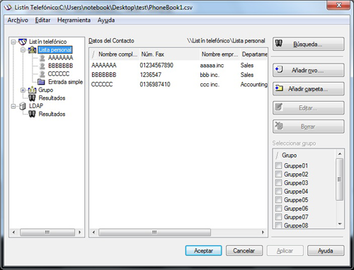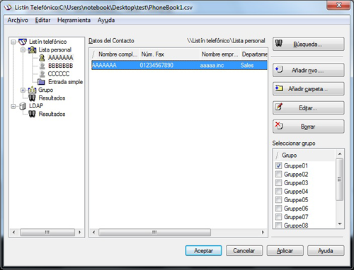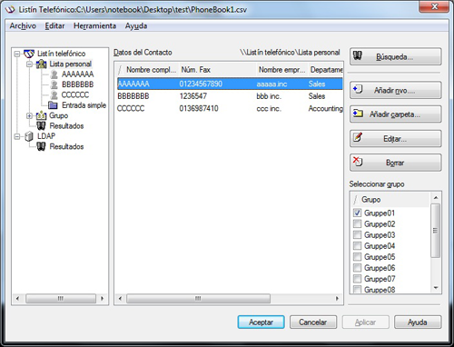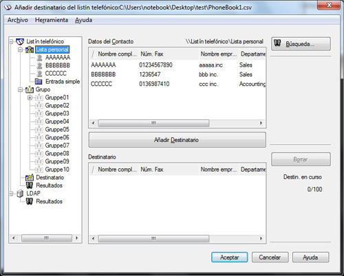 Los datos de contacto quedan registrados y visibles debajo de [\\Listín telefónico\Lista personal]. Si ha seleccionado varios grupos para el destinatario, aparecerán en la lista de grupos.