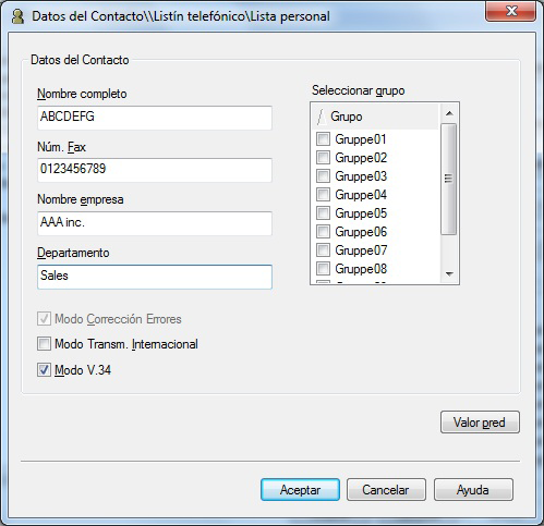 [Seleccionar grupo] | Al añadir un destinatario al grupo, seleccione la casilla de verificación de este grupo. También puede añadir un destinatario en varios grupos. Una vez añadido, puede especificar los destinatarios seleccionando su grupo (para difusión). Si envía faxes frecuentemente a miembros determinados, será útil añadirlos a un grupo. |