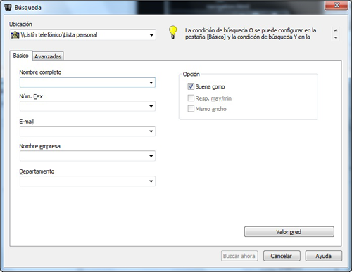 La búsqueda [Básico] muestra los destinatarios que cumplen con las condiciones de búsqueda. Introduzca los caracteres que desea buscar y haga clic en [Buscar ahora].