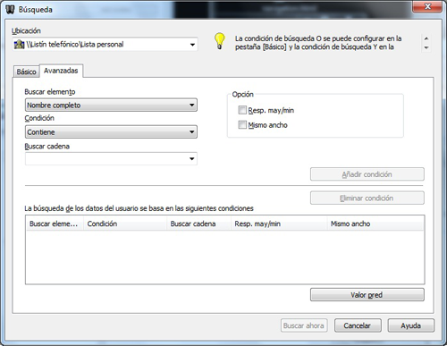 La búsqueda [Avanzadas] muestra los destinatarios que cumplen con todas las condiciones de búsqueda. Seleccione un elemento en [Buscar elemento] y la [Condición]. A continuación, introduzca los caracteres de búsqueda y haga clic en [Añadir condición]. Especifique varias condiciones de búsqueda si es necesario y haga clic en [Buscar ahora].