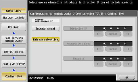 Para obtener automáticamente la dirección IP de esta máquina utilizando DHCP, active la función Entrada automática para obtener automáticamente una dirección IP de DHCP (valor predeterminado: activado). Para obtener más información, consulte Aquí.