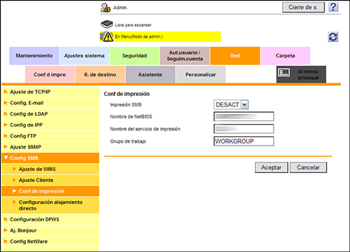 [Impresión SMB] | Seleccione [ACTIV.] para utilizar la función de impresión SMB. [DESACT] es la opción predeterminada. |