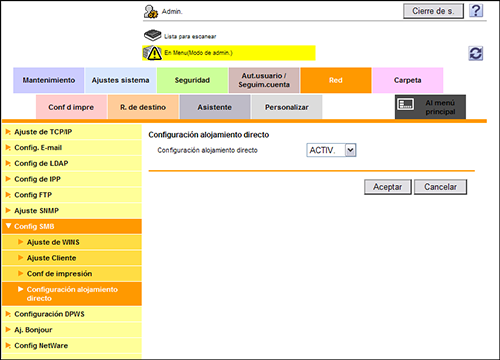 En el modo Administrador, seleccione [Red] - [Config SMB] - [Configuración alojamiento directo] y, a continuación, defina [Configuración alojamiento directo] en [ACTIV.] (Valor predeterminado: [ACTIV.]).