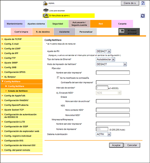 En el modo administrador, seleccione [Red] - [Config NetWare] - [Config NetWare] y, a continuación, configure las siguientes opciones.