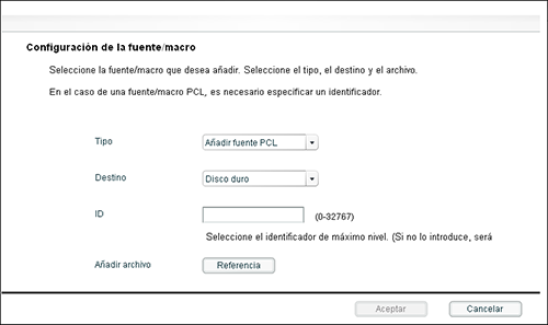 [ID] | Introduzca el número de identificación de una fuente o macro para una fuente PCL o macro PCL. Si no lo introduce, se asignará automáticamente una identificación disponible. |