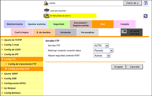 En el modo Administrador, seleccione [Red] - [Configuración FTP] - [Config servidor FTP] y, a continuación, configure las siguientes opciones.